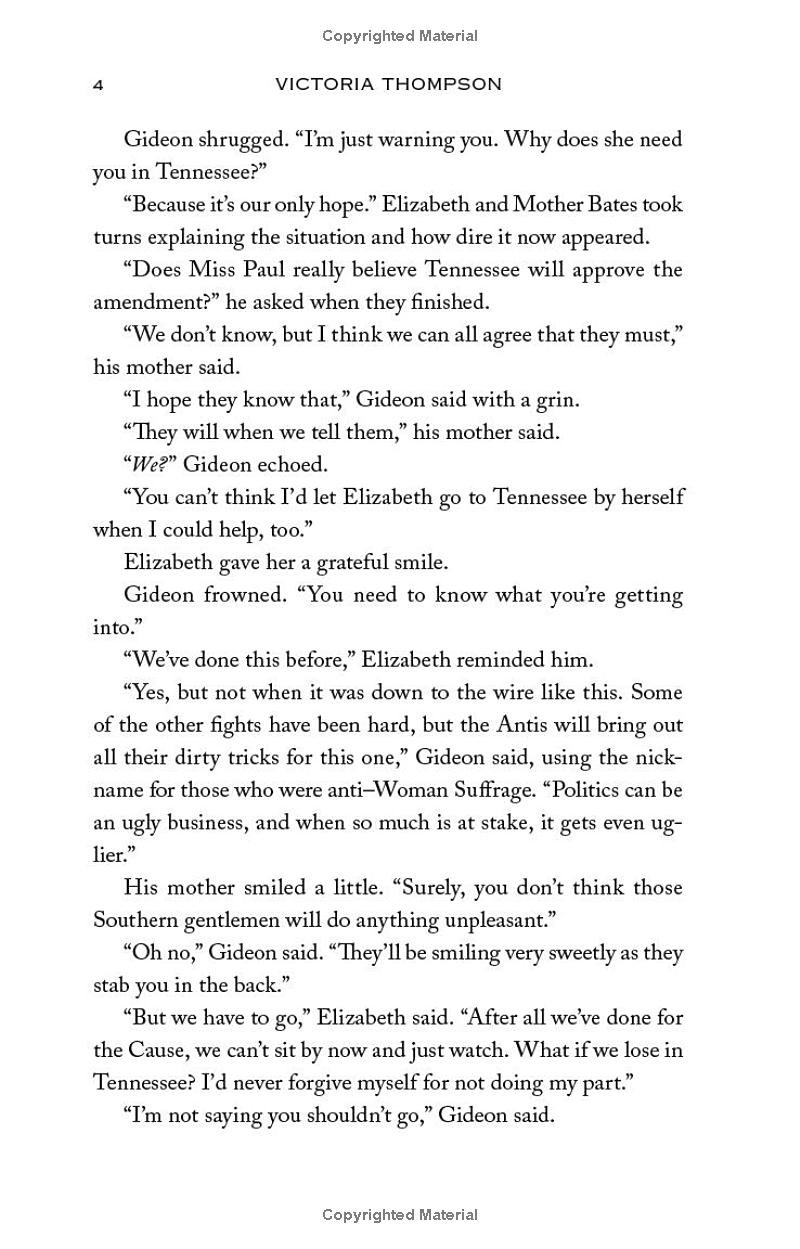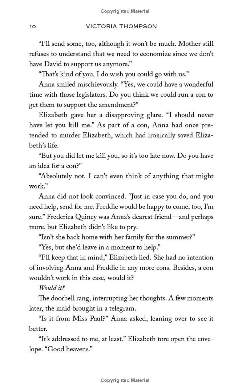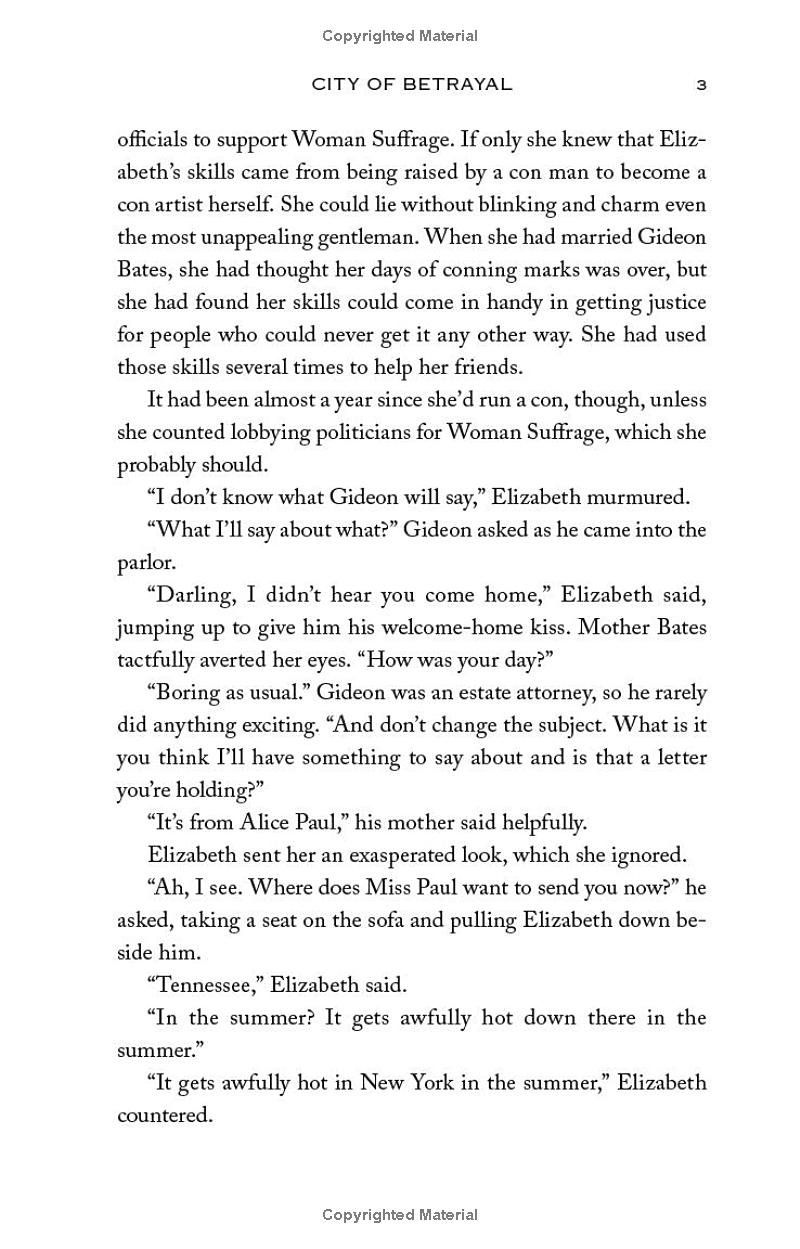 Elizabeth’s ability to interact with difficult men and to persuasively explain all the advantages of allowing women to vote—all skills she perfected as a grifter—have made her a valuable member of the team. But she would never have expected the lengths to which some would go to keep the vote out of women’s hands. She’ll need to devise the perfect con or the suffragists’ life’s work could all be for nothing.