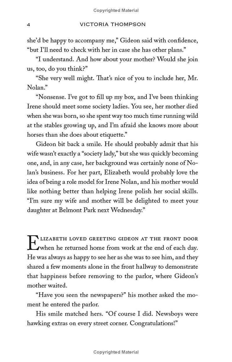 Irene Nolan seems more interested in horses than husbands, and she jumps at the chance to show Elizabeth her horse, Trench, and introduce her to his rider, Cal Regan. Elizabeth soon realizes there is more than just a working relationship between Irene and Cal. But she also knows that Irene’s father would never allow his only daughter to marry a jockey. When Cal takes a terrible tumble injuring both himself and Irene’s beloved Trench, Elizabeth and Gideon learn that the mishap was not simply bad luck—the horse and rider are victims of sabotage.
