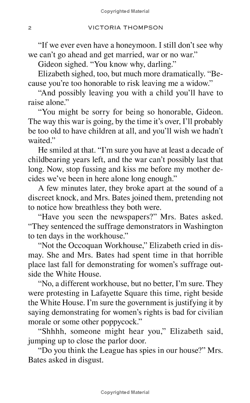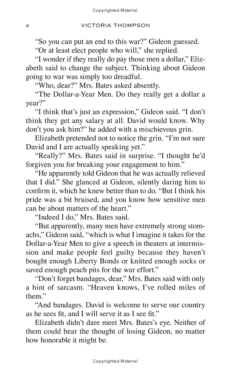 Elizabeth Miles finds herself in a position no scheme can help her escape: Her beloved fiancé, Gideon Bates, is awaiting his draft notice to fight in the Great War. Elizabeth finds it hard to think of anything else, but Gideon has thrown himself into his work, preparing wills for soldiers before they ship out.