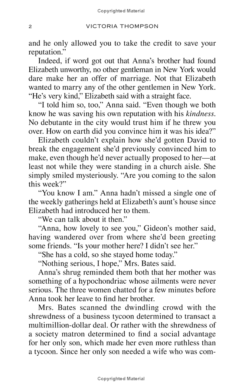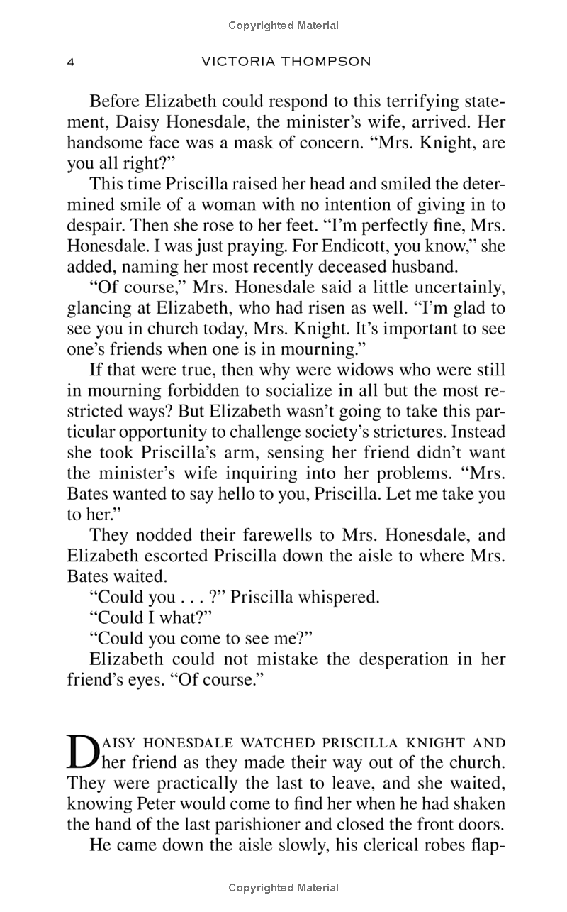 Priscilla stands to lose everything, and Elizabeth is determined not to let that happen; but as always, Elizabeth walks a fine line between using her unusual talents and revealing her own scandalous past. Elizabeth soon discovers that Endicott’s death was anything but accidental, and that revealing the truth could threaten much more than Priscilla’s finances. To save her new friend’s future—and possibly her own—Elizabeth, along with her honest-to-a fault beau, Gideon, delves into the sinister secrets someone would kill to keep.