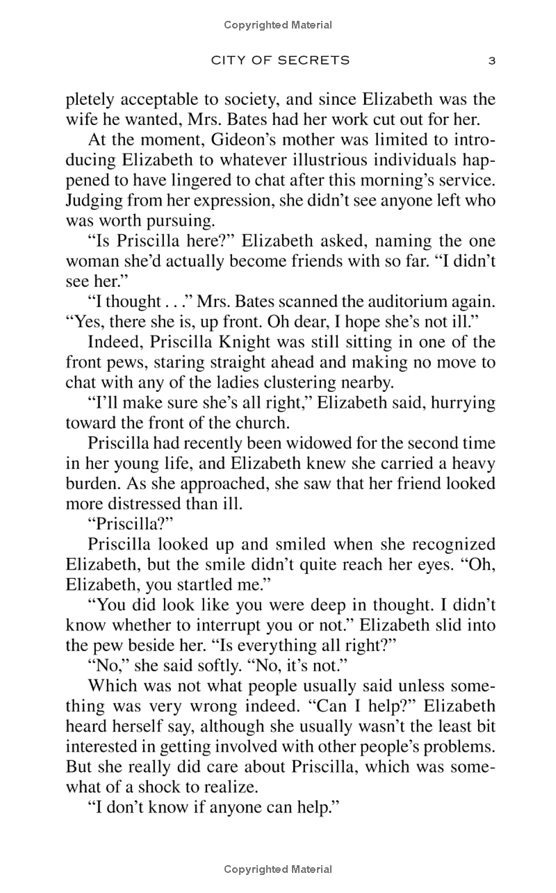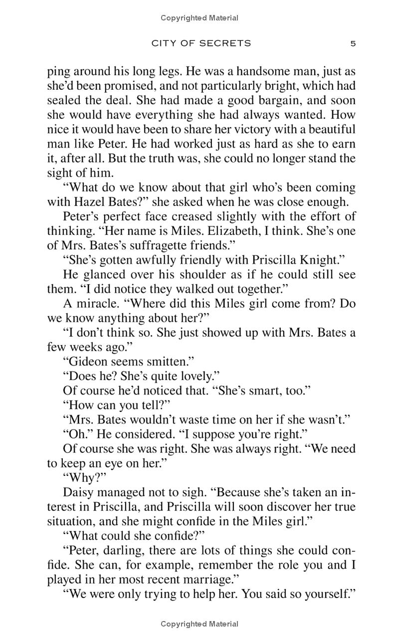Elizabeth has discovered that navigating the rules of high society is the biggest con of all. She knows she can play the game, but so far, her only success is Priscilla Knight, a dedicated young suffragist recently widowed for the second time. Her beloved first husband died in a tragic accident and left her with two young daughters—and a sizable fortune. While she was lost in grief, her pastor convinced her she needed a man to look after her and engineered a whirlwind courtship and hasty marriage to fellow parishioner Endicott Knight. Now, less than nine months later, Endicott is dead in what appears to be another terrible accident.