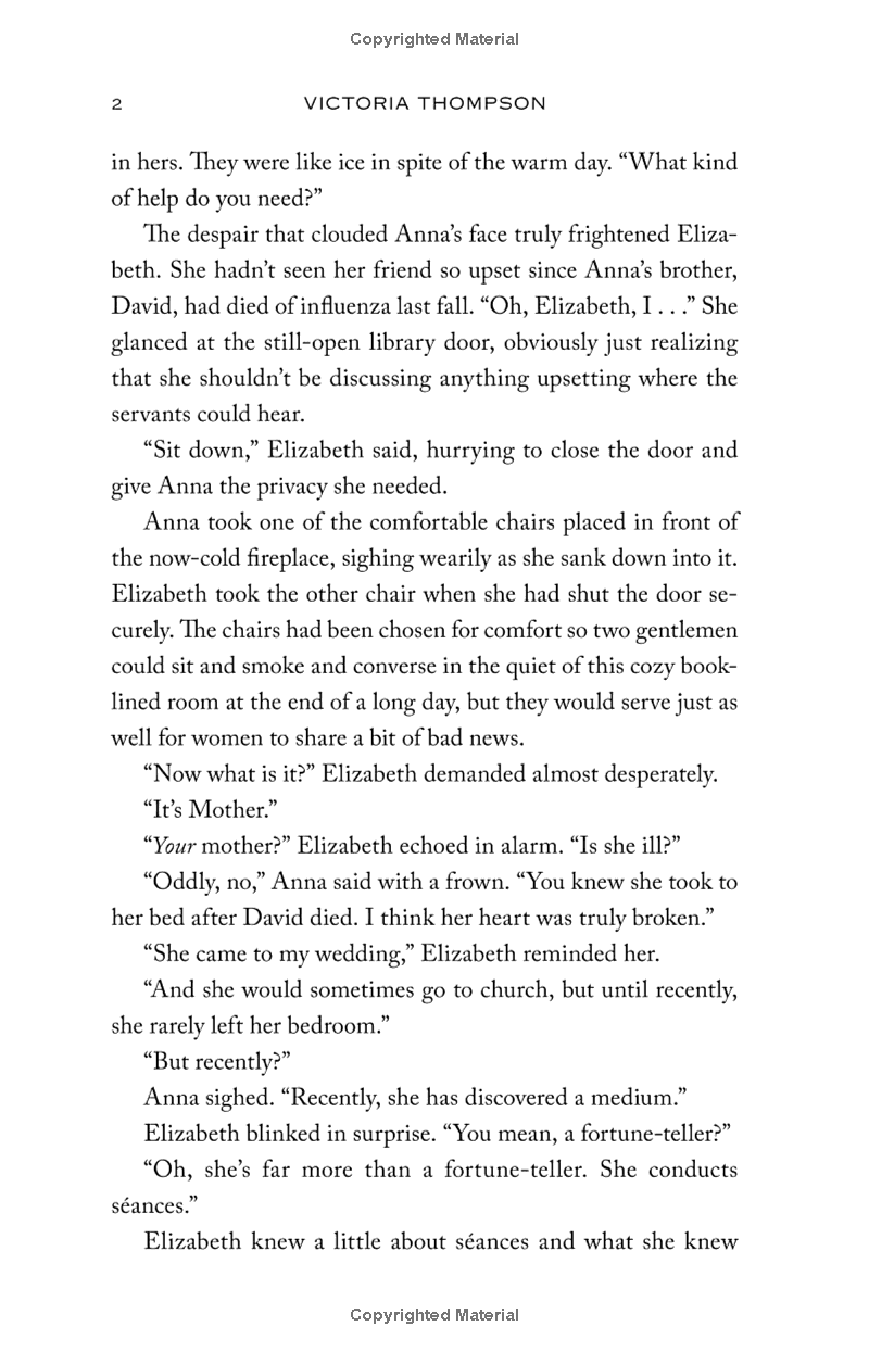 Elizabeth Miles Bates has returned from her honeymoon with Gideon and is taking great pride in having completely forsaken her disreputable past. Then her friend Anna Vanderslice begs her to use her talents to save her widowed mother from an unscrupulous medium. Since the war and the flu epidemic left so many families in mourning, séances have come back into vogue as desperate families long to communicate with their loved ones.