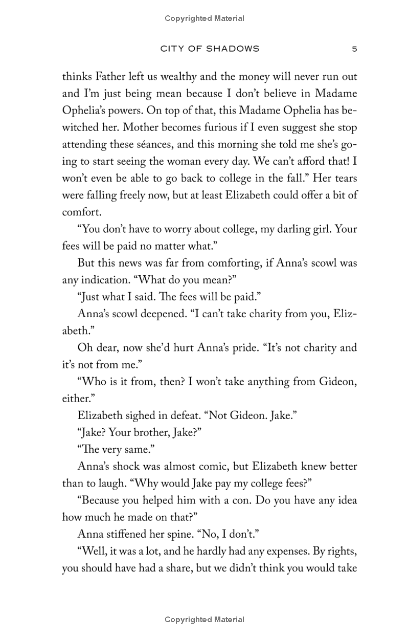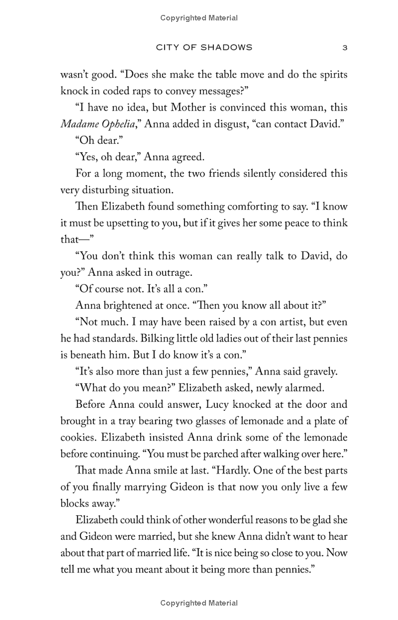 Madame Ophelia is working with a group of con artists to fleece as many grieving New Yorkers as possible before moving on to another city. Several of Mrs. Vanderslice’s friends, as well as some of Gideon’s clients, have already been victims. Elizabeth knows that simply exposing the medium as a fraud will not be enough to recoup the stolen money; the only way is to con the medium and her cohorts. But will Elizabeth’s family help her when it means betraying other con artists? Elizabeth recruits Gideon, her aunt Cybil, and her partner, Zelda, to lend a hand. Can Elizabeth and her gang of amateurs fool the professionals? Or will speaking to the dead lead to deadly consequences?